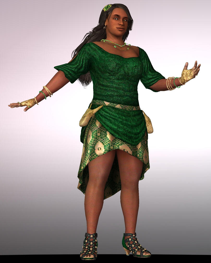Azolia's palette is green (light and dark) and gold. Any future outfits for her would probably have similar design sensibilities, but would have a different style; she has an interesting fashion sense, which should be taken advantage of. The jewelry and floral accents are a must.CREDITS